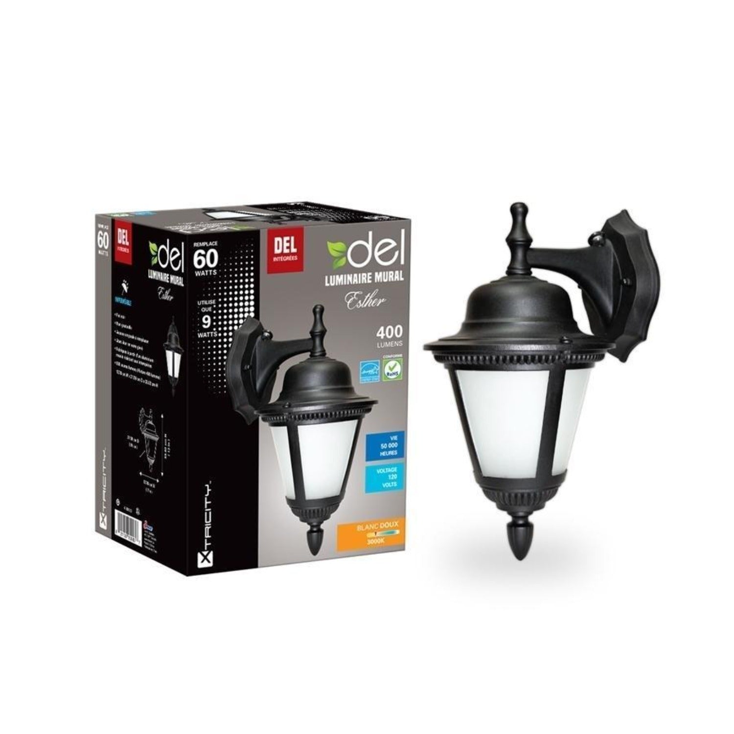The Esther LED Outdoor Wall Light from Xtricity offers an elegant and efficient lighting solution. With its power of 9W, equivalent to 60W, it delivers a brightness of 400 lumens, creating a welcoming atmosphere. The color temperature of 3000K in soft white adds a warm touch. Designed for outdoor use, this black light fixture from the Esther Collection combines contemporary style and functionality. Its rated lifespan of 50,000 hours guarantees exceptional longevity. Illuminate your outdoor spaces with sophistication and efficiency.