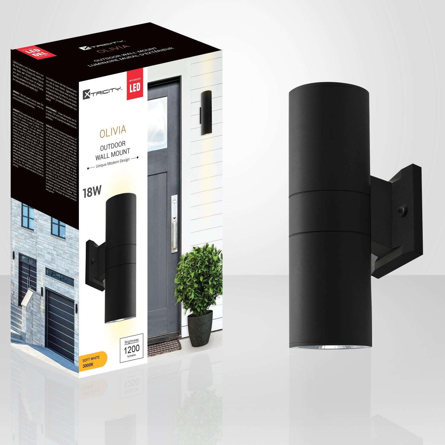 The Olivia LED Outdoor Wall Light from Xtricity offers an exceptional power of 18W, equivalent to 120W, for optimal outdoor lighting. With a brightness of 1200 lumens and a color temperature of 3000K in soft white, it creates a welcoming atmosphere. Designed for outdoor use, this black light fixture from the Olivia Collection combines contemporary style and functionality. Its rated lifespan of 50,000 hours guarantees exceptional longevity. Illuminate your outdoor spaces with sophistication and efficiency.