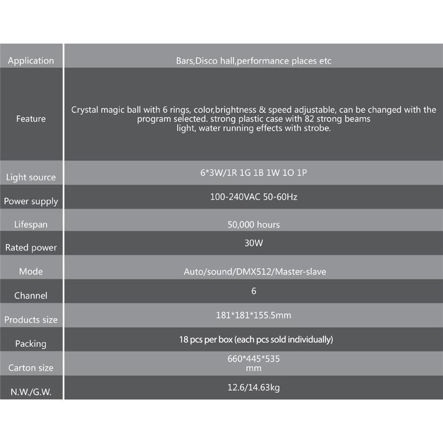 Light source: 6x3W (1 Red / 1 Green / 1 Blue / 1 White / 1 Orange / 1 Purple)