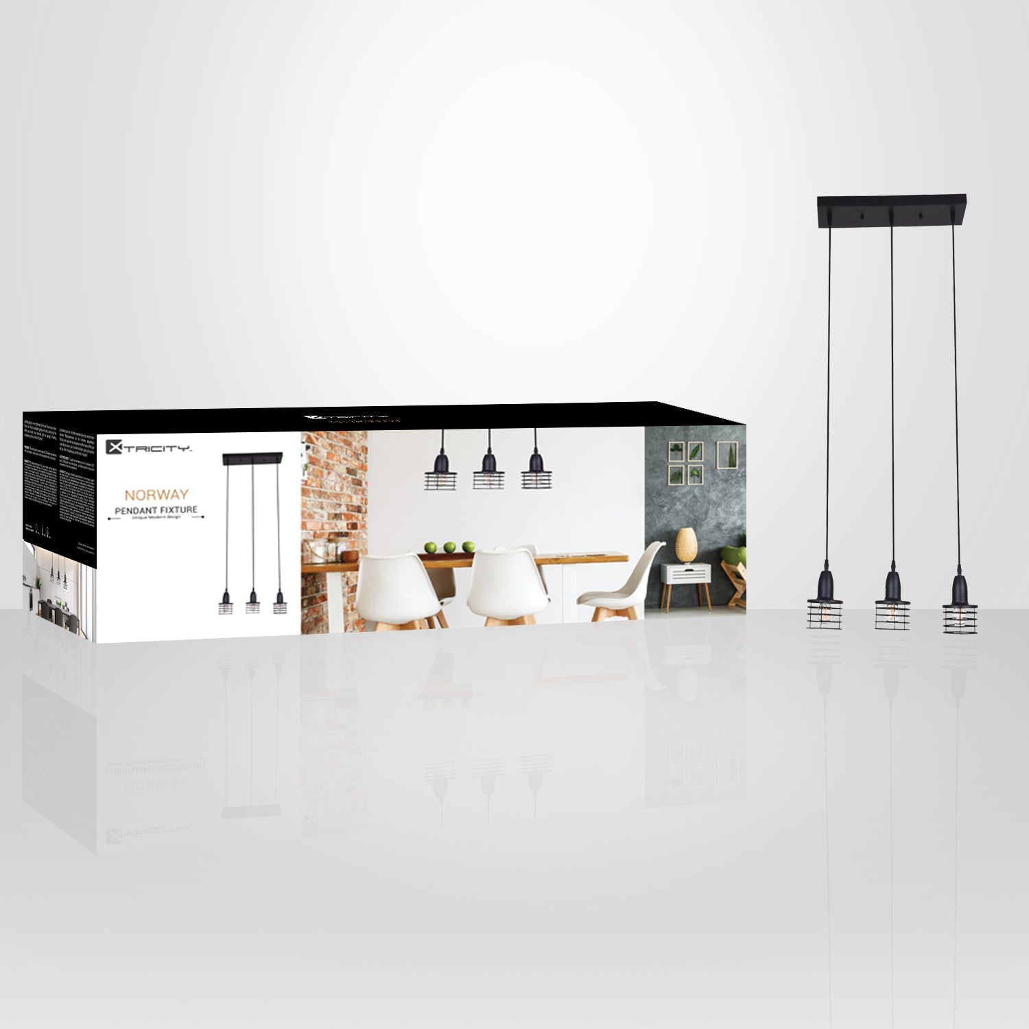 Elevate your decor with the Norway Collection Xtricity 3-Light Pendant in Black. A perfect fusion of contemporary style and functionality. The three E26 bases provide balanced brightness, ideal for elegantly illuminating your space. The sophisticated black finish suits any interior, while the 150cm cord allows for versatile installation. Create a warm ambiance with this pendant light, a remarkable addition to your home.