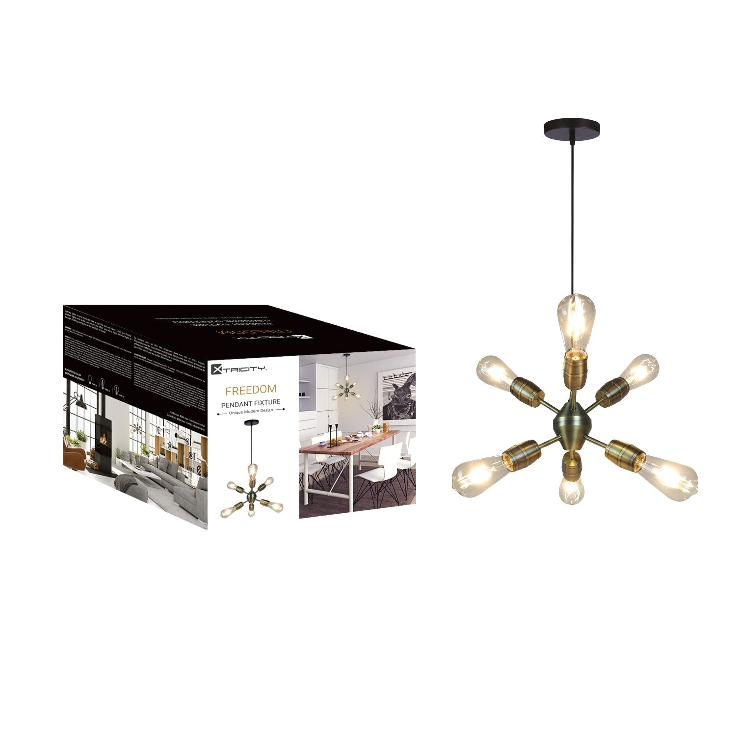 The Freedom Collection Xtricity 6-Light Pendant in Antique Brass creates a majestic ambiance in your space. Complete your decor with this imposing pendant light. Equipped with six E26 bases (60W max each, bulbs sold separately), it offers warm lighting. The brushed bronze finish adds a touch of elegance, and the 150 cm cord allows for custom installation. Transform your interior with the Freedom pendant light.