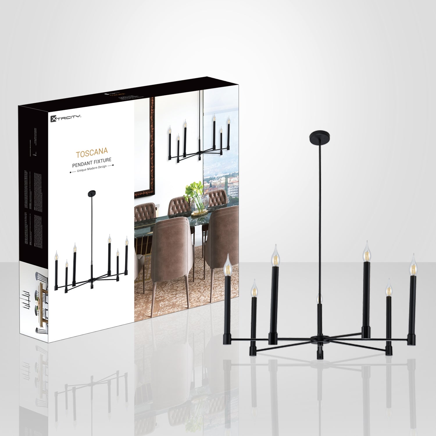 Give a contemporary look to your space with the 7-light pendant from the Toscana collection by Xtricity. Its sleek design and timeless black finish create a modern ambiance in any room. The 7 E12 sockets add warm brightness, up to 40W per bulb (not included). Adjustable cord length up to 120 cm (47.2'') provides placement flexibility. Transform your interior with this versatile, height-adjustable pendant light, ideal for a variety of spaces.