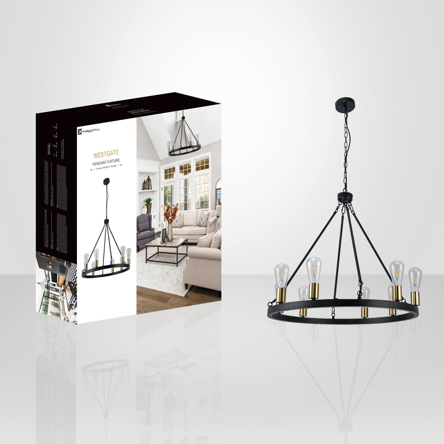 Transform your space with the pendant light from the WestGate collection by Xtricity. Its six lights create a warm and elegant atmosphere. The black and gold finish adds a touch of sophistication. Equipped with eight E26 sockets, it offers lighting versatility. Bulbs up to 40W (not included) add welcoming brightness. With an adjustable 50 cm (19.6'') cord, this light fixture adapts to different ceiling heights. Enhance your interior with this pendant light combining modern style and classic charm.