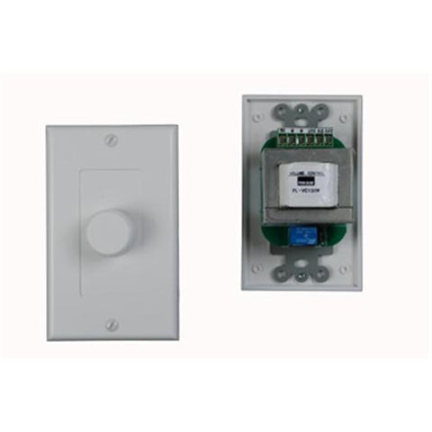 Rotary volume control for 70v distribution network Contact closure overwrite. Contour Decora plate included Commercial grade 100 watts rms Connectors with screws for input and output Designed for daisy chain sound distribution network White finish Depth: inside the box 50mm. Width inside the box 50mm.