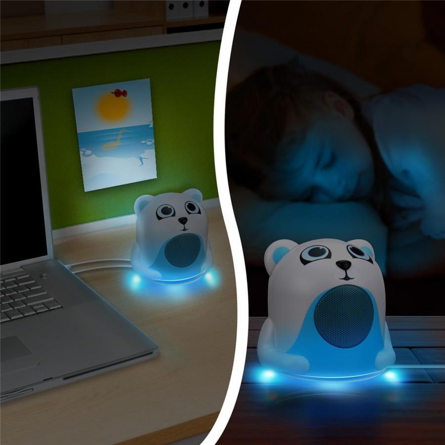 GOgroove Polar Bear Bright Light-Up Mood SpeakerCute Look , Powerful SoundDont let the cute exterior fool you! The compact design fits in the palm of your hand , but also houses a powerful 40mm high-excursion driver AND passive bass woofer for full-range audio. Simply plug the 3.5mm aux cable into the headphone port of your favorite media device and adjust the on-board volume control for a great listening experience anywhere.Portable PlaybackThis versatile , compact speaker accepts power by battery or USB cable. Simply insert 3 AAA batteries for an incredible 12 hours of audio! For continuous power , use the included USB cable with your computer or other 5V USB adapters.Playful DesignThe Groove Pal junior loves to make friends! The 3.5mm Pal Link port allows you to connect additional Groove Pals for even GREATER sound. The innovative LED base compartment holds the batteries and also features a stow-away 3.5mm audio cable. Switch on the LEDs and the base will glow while you play your music for a fun audio-visual experience! All GOgroove products are backed by Year Manufacturers Warranty!Place them in your... Bedroom , Baby Room , Play Room , Guest Room , Living Room , Reading Rooms and many others!Excellent for... Babies , Infants , Toddlers , Kids , Children , Teens , and even Adults!