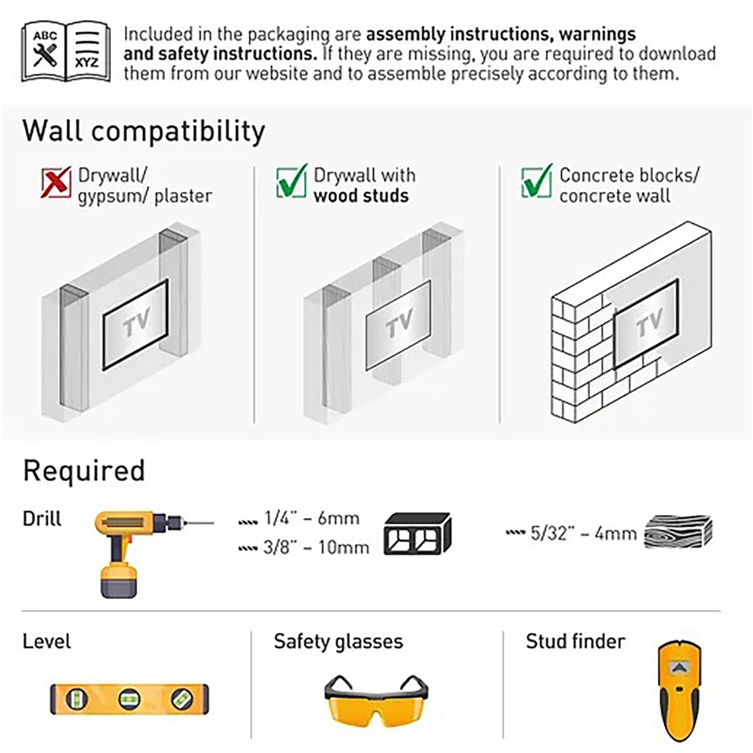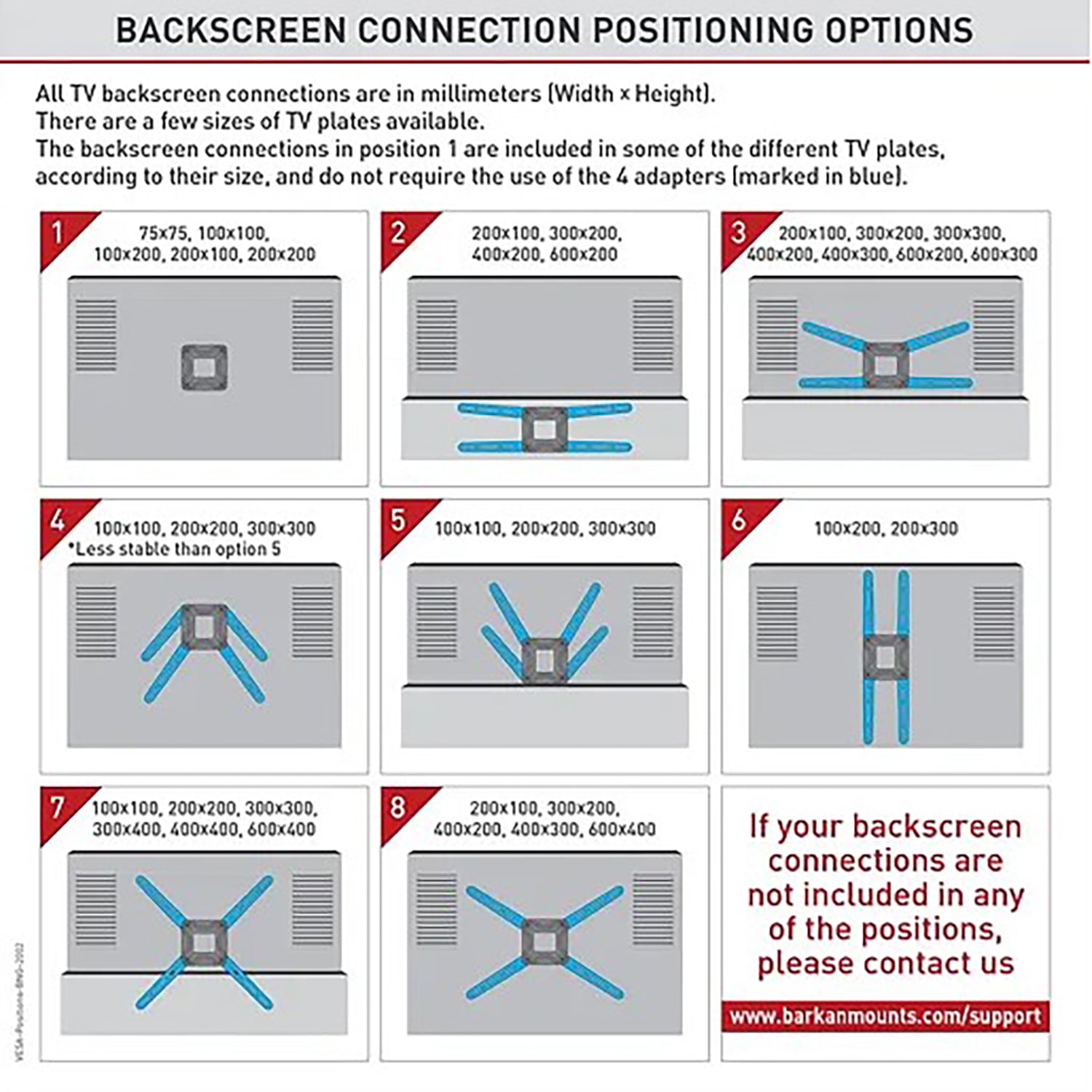 - Compatible with TVs that comply with VESA standard (bracket mounting hole patterns) 100 x 100, 100 x 200, 200 x 100, 200 x 200, 200 x 300, 300 x 200, 300 x 300, 300 x 400, 400 x 200, 400 x 300, 400 x 400 mm and non-VESA up to 400x400 mm.