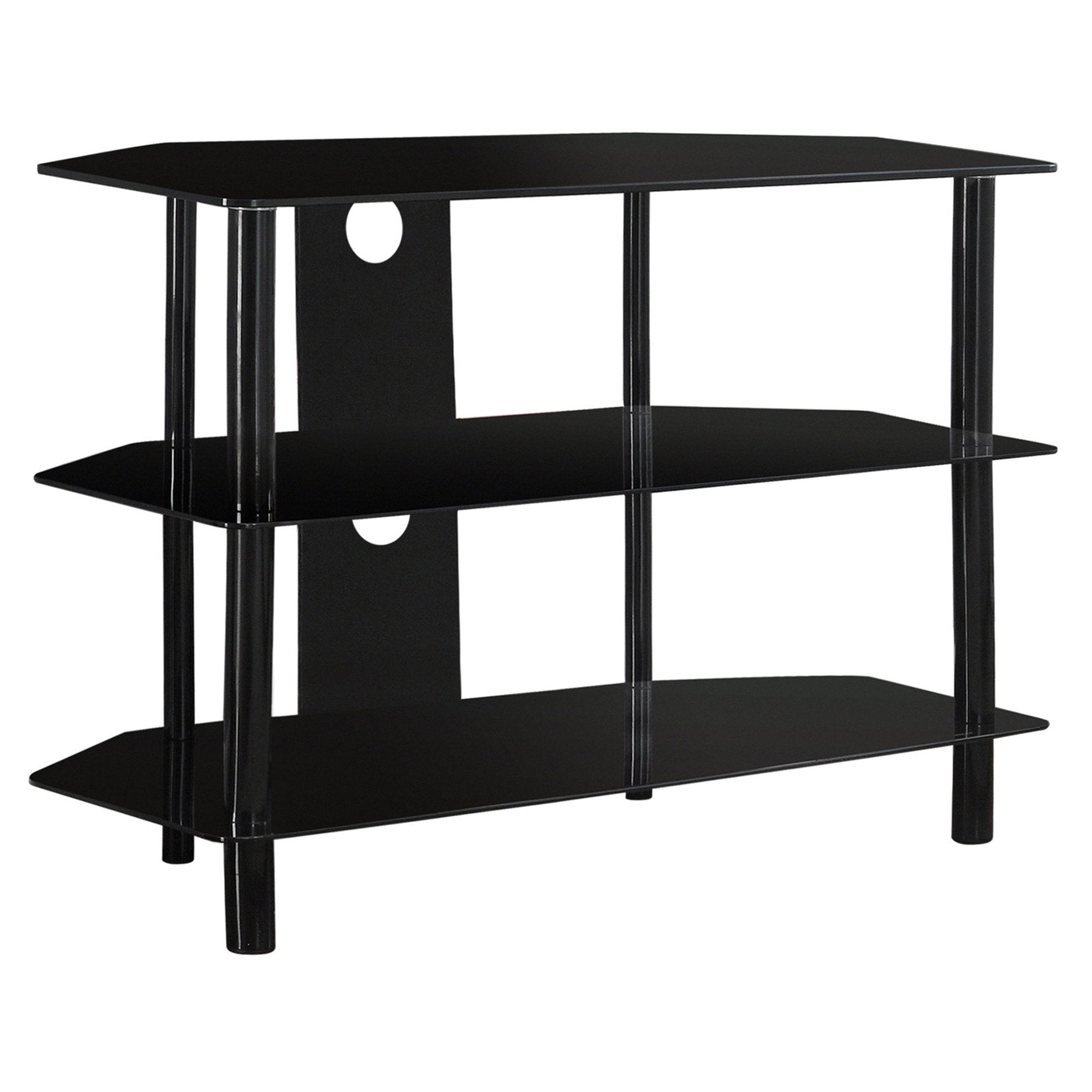 Whether it's time to liven up a room's entire look or you just want to update your entertainment center, this sleek, contemporary design is a smart choice. This stand features three open, tempered-glass shelves to help organize your media needs. Ideal for smaller spaces, this stand can be used against the wall or can fit into a corner.Accommodates all TV sizes with a center stand.