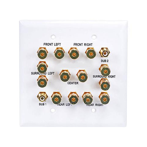 Special order, 1-2 additionnal business days required.7.1 Banana binding post gold plated wall plate for 7 speaker pairs white (Coupler type F/F) + 1 gold plated RCA plug for subwoofer + HDMI