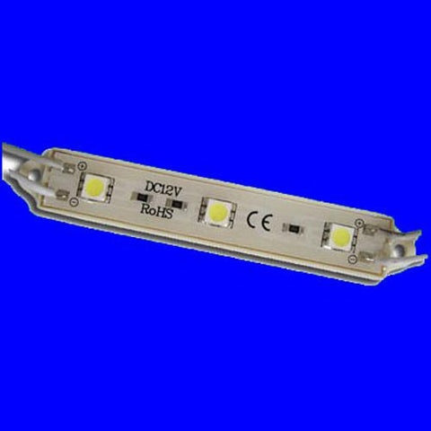 3 LED lights module with single color Color : Cold White LED quantity : 3 per module 12V - 0.06A 0.72W Spill resistant (IP65) With 3M auto-adhesive back tape Indoor use only
