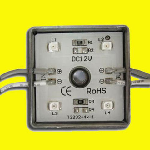 4 LED lights module with single color Color : Yellow LED quantity : 4 per module 12V - 0.12A 1.44W Spill resistant (IP65) With 3M auto-adhesive back tape Indoor use only