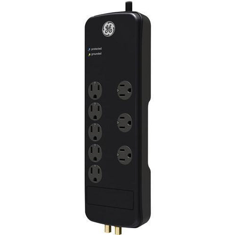 This GE 8 outlet surge protector is designed with 8 ft. cord w/ a low profile plug Coax / Cable protection to protect cable boxes and other audio/video devices from surges It has keyhole slots for wall mounting and indicator lights to show that the surge components are working and the outlets are properly grounded Includes an integrated circuit breaker...