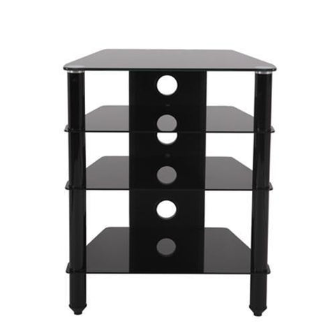 TV unit with 4 tempered glass shelves on floor. Large shelves of 23.5" x 17.75" (600 mm x 450 mm) Height of the cabinet 29.5" (750mm) 4 clear tempered glass shelves and black colored posts. Tempered glass shelf 8 mm thick for top shelf and 6 mm shelf for middle and bottom shelves. Solid construction. Cable organizer in the back...