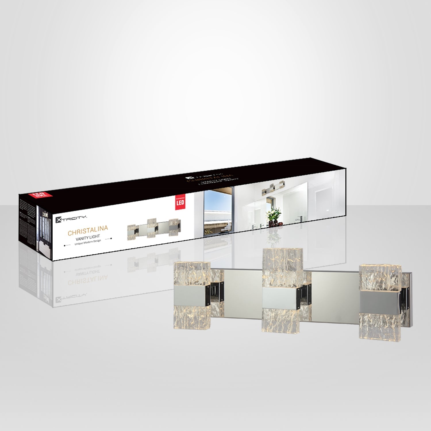 Opt for dazzling elegance with the LED vanity light from the Christalina collection by Xtricity. Its chrome finish brings a touch of sophistication to your space. This vanity light uses only 3 5W LED bulbs, each generating 400 lumens of soft light (3000K). Create a warm ambiance in your bathroom while adding a modern aesthetic. Easy installation makes it a practical choice to brighten up your daily routine. With the Christalina collection, add a touch of luxury to your bathroom decor.