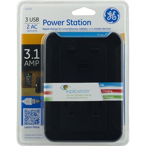 This GE wall tap 2 outlet charging station surge protector includes 3 USB charging ports (3.1A total output / 15W) for charging of smartphones, tablets and mobile devices