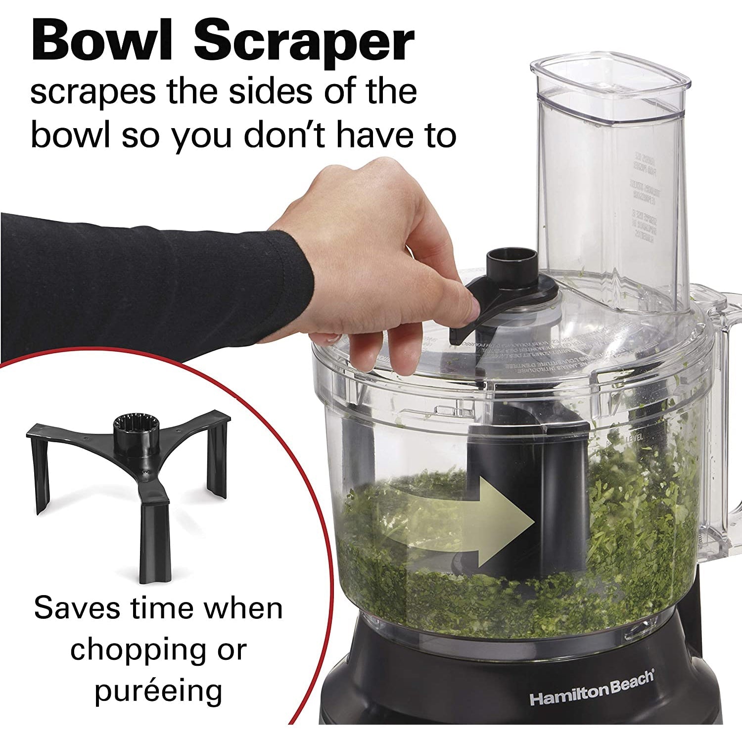 One of the biggest frustrations in food processing is stopping to scrape the sides of the bowl. All that stopping and going is inefficient, especially when you have to dine on the table. With the Hamilton Beach Scraper, you save time when chopping or mashing - no need to stop and remove the lid to dislodge food from the side of the bowl. The built-in scraper does the work for you, and you can use it while the processor is on or off for continuous processing.
