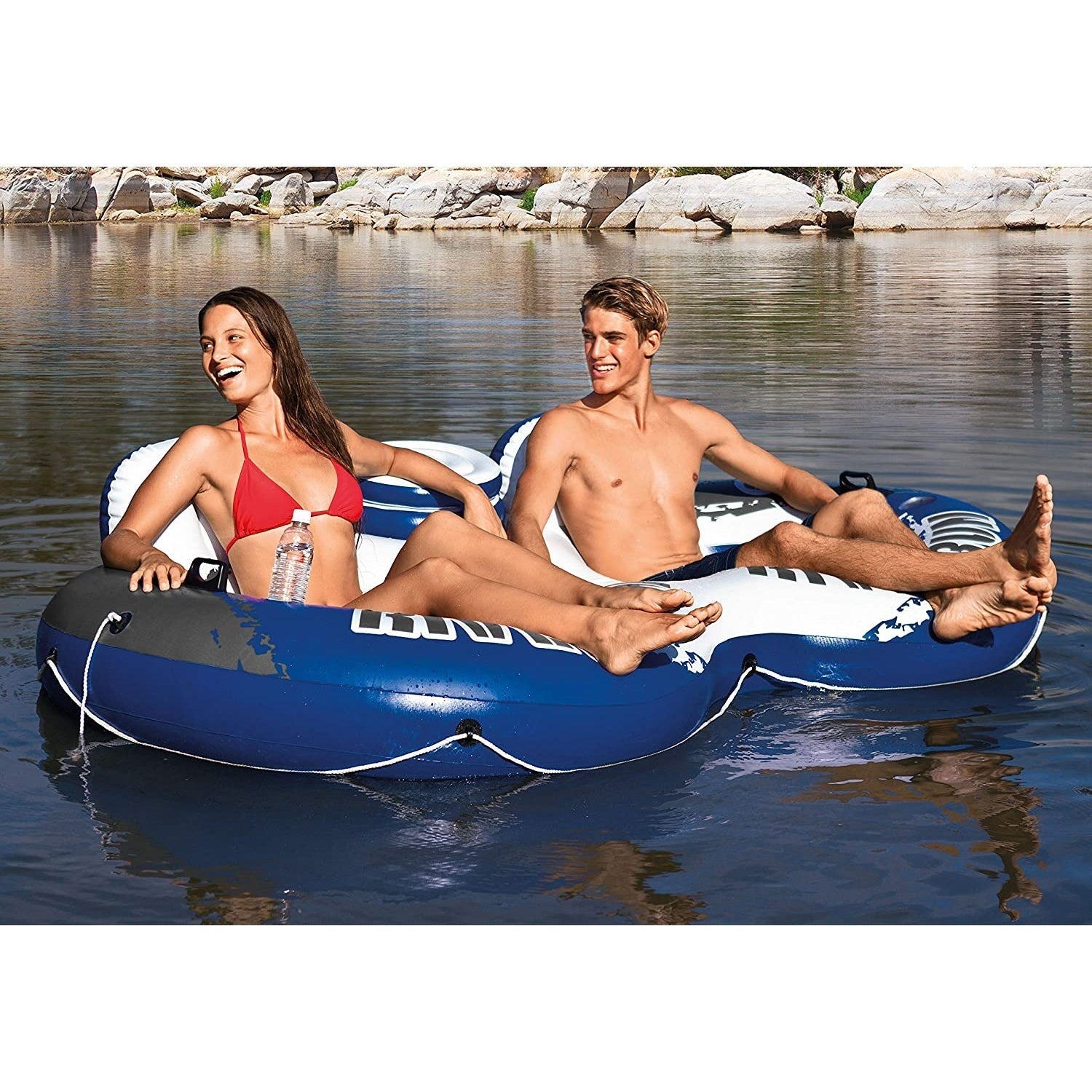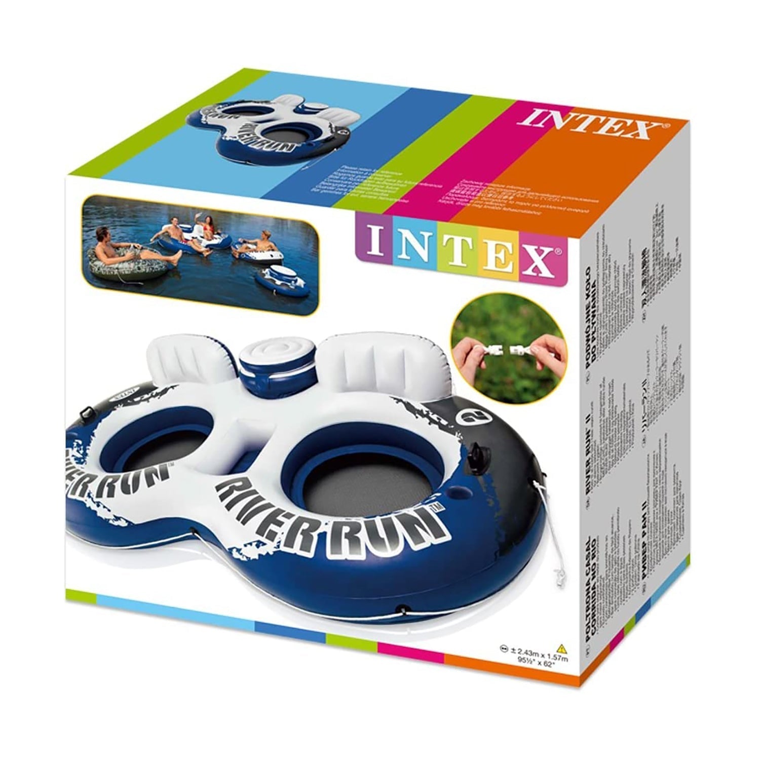 Have fun relaxing and floating in the pool or lakeside with the Intex® River RunT II Inflatable Water Tube. Designed with two interconnected lounges and a large built-in cooler with lid, this lounge is perfect for floating around with a friend. Built-in folders make it easy to navigate, and the mesh bottom keeps you cool. This fun lounger features five air chambers for added safety and two built-in drink holders to keep your refreshments close while you relax in the water. easy-to-use connectors are included to attach it to other Intex® River RunT floats. An all-around grab rope and two sturdy grab handles are included for easy use.