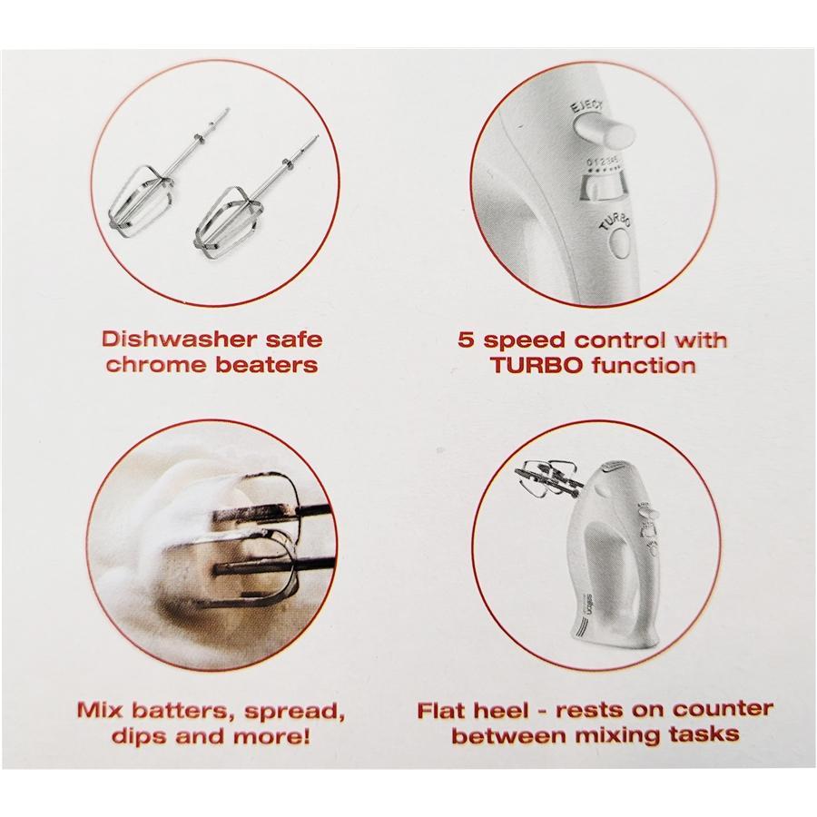 Save time in the kitchen with the Salton Essentials hand mixer. Whether you're whipping a meringue or baking cookie dough, this hand mixer makes it easy to do with its 5 speeds and comfortable ergonomic handle.