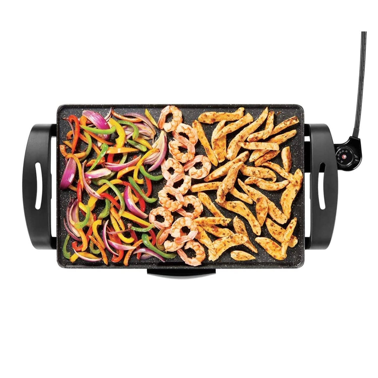 The electric griddle features a patented Rock.Tec surface enhancement. This treatment consists of steel pellets that harden the surface of the grill, making it hard as a rock. With unmatched non-stick performance and ultimate scratch resistance, this griddle will stand the test of time. It's big enough to cook a full meal: meats on one side, eggs on the other or steak, fish or chicken on one side and vegetables on the other. There are so many combinations to choose from for so many great meals!
