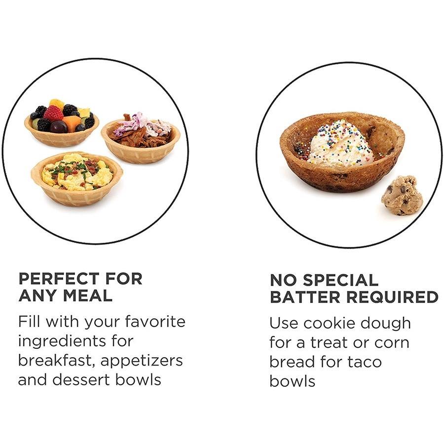 The Salton Waffle Bowl Appliance is the easy way to make gourmet embossed bowls at home! No special mix required! Use cookie dough or cornstarch for tacos. The ideal device for all lunches, dinners, dinners, aperitifs and even desserts. The nonstick cooking surface ensures even heat distribution while the insulated handles, lid lock and non-slip feet make this unit safe and easy to use.