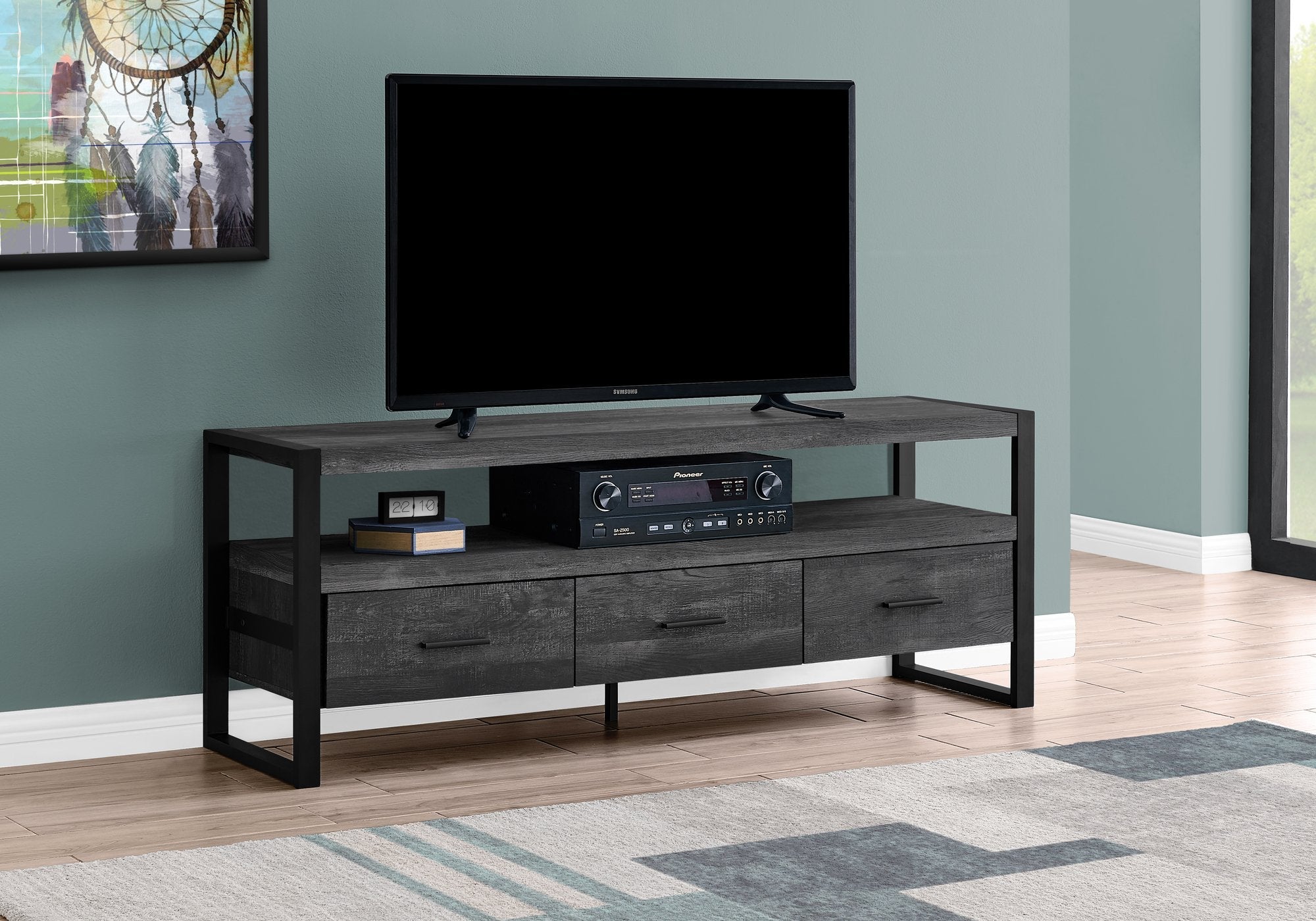 Bring an industrial-inspired style to your entertainment space with this low-profile open back TV stand. The bold design starts with strong black satin metal supports at each end and in the center, with thick paneled 60-inch-long shelving that can hold any size TV once centered. Finished in an elegant black reclaimed wood-look, this TV stand features a long open shelf to place your audio/visual equipment or a sound bar. The three closed drawers on smooth metal glides, are accented with sleek black handles, roomy enough to store all your accessories, keeping everything organized in one place but out of sight. Assembly is required.