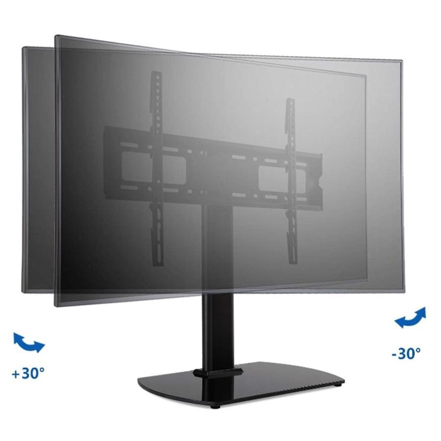 The GlobalTone Flat Panel TV Table Mount is designed for most 32-65 inch TVs and can support up to 40kg (88lb). With its VESA 600x400 format, it fits most TVs in the suggested range. Equipped with a left to right pivot up to 30 degrees. The box contains everything you need to build the stand and install it on the TV. The user manual is also included in the box.