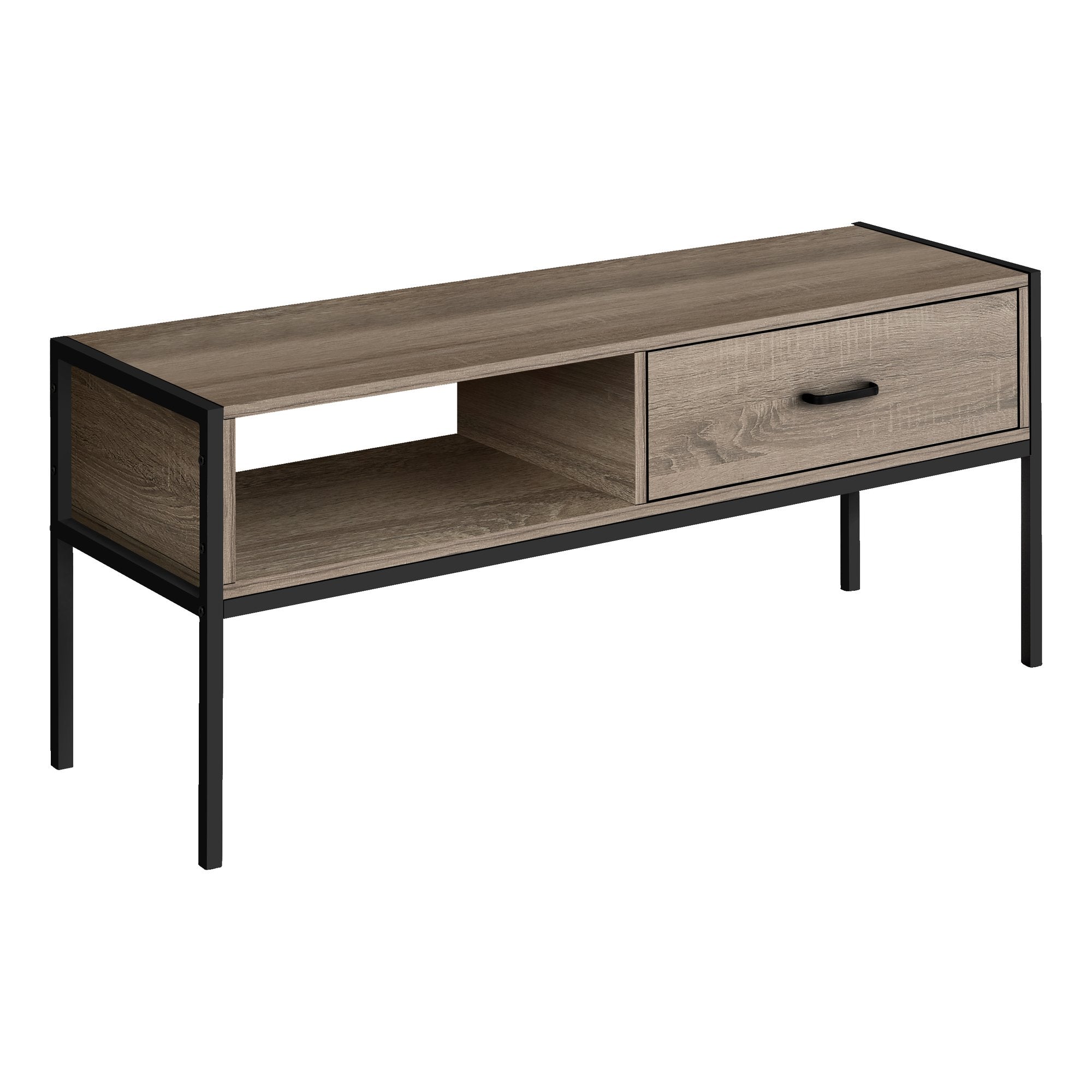 This streamlined TV stand with storage will give your living room or bedroom a leg up on style. Boasting an industrial-inspired design, it features a slender black metal frame with tall legs. The top panel, open shelf, and drawer in a dark taupe wood-look finish offer flexible storage solutions for your entertainment center components. Most TVs can be accommodated on the top panel when centered, while the shelf underneath is open in the back for easy cable management. The drawer can be positioned on the left or right as desired and glides smoothly on metal drawer slides. With its compact design and clean lines, this media console is great for a condo, apartment, or small home.