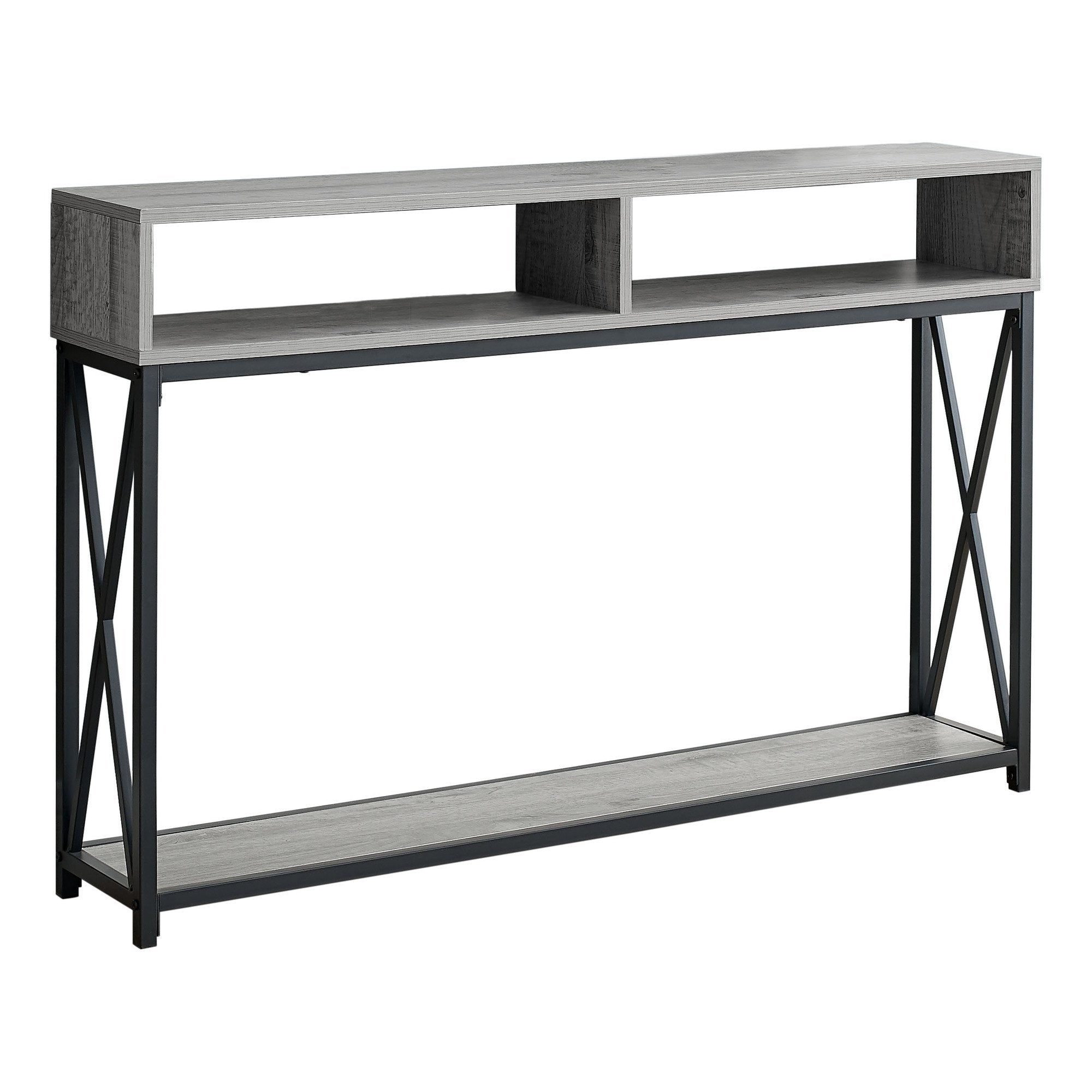 Adding plants, baskets, books or other decor items to the entryway, living room or bedroom? Featuring 2 open shelves, this console table is a stunning combination of grey wood look tones with a sturdy X-design black metal frame to pair with any style. Also including a bottom panel for additional space, this accent table is your versatile storage solution at a perfect height and compact design to bring an edge to your small home, apartment or condo. It will look fabulous anywhere!