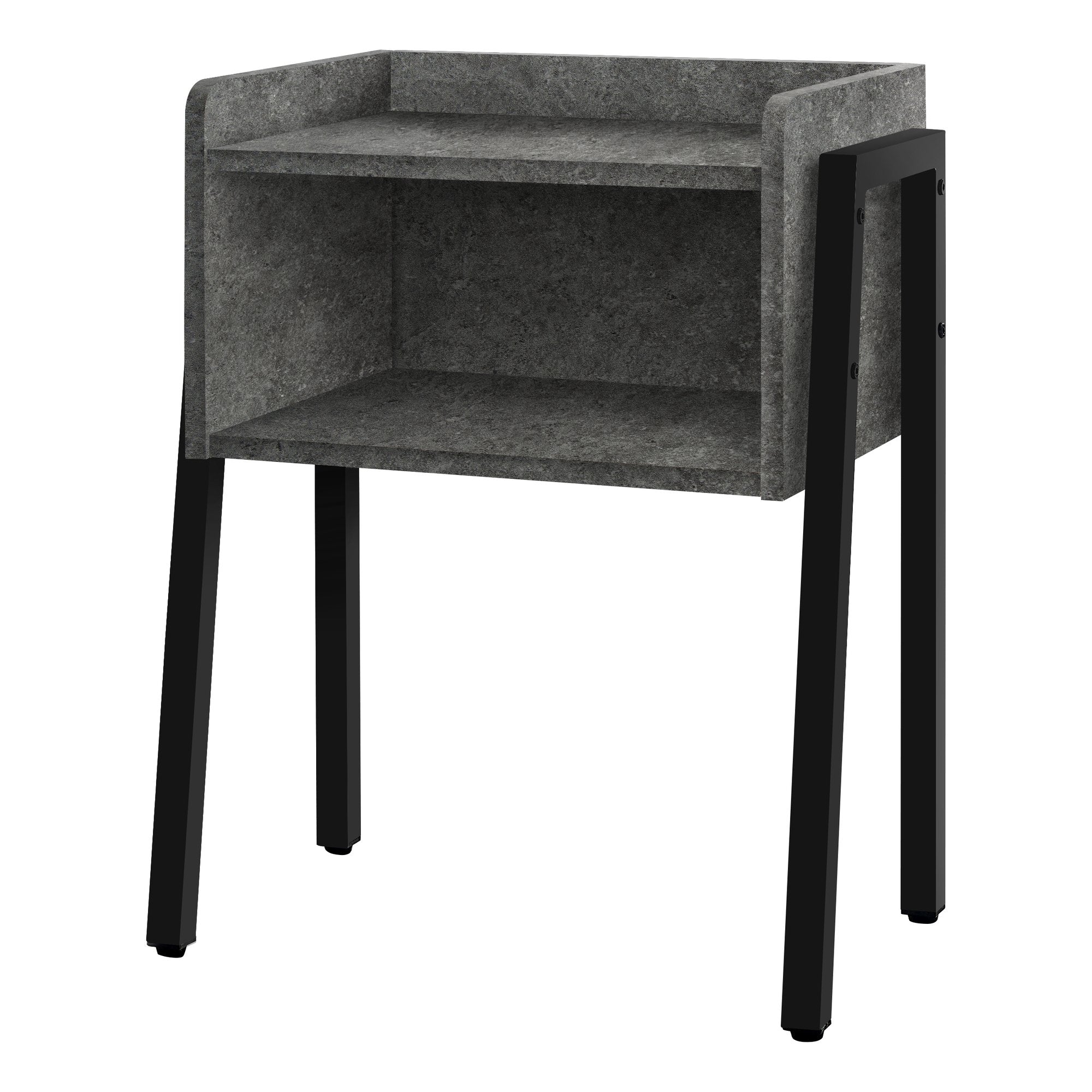With this accent table, you'll have storage and style by your side. Placed beside a sofa, chair, or bed in a living room or bedroom, this versatile end table or nightstand with storage provides convenient surfaces for keeping items within reach. Place a small lamp and mobile devices on the tabletop that has a tray-like style with raised edges along the sides and back to help prevent items from rolling off the surface. Underneath is a wide, deep storage cubby that offers a place for a box of tissues or a stack of books. The top of the table is in a grey stone-look finish with a slight texture and is supported by thick black metal legs that are exposed for a modern-industrial look.