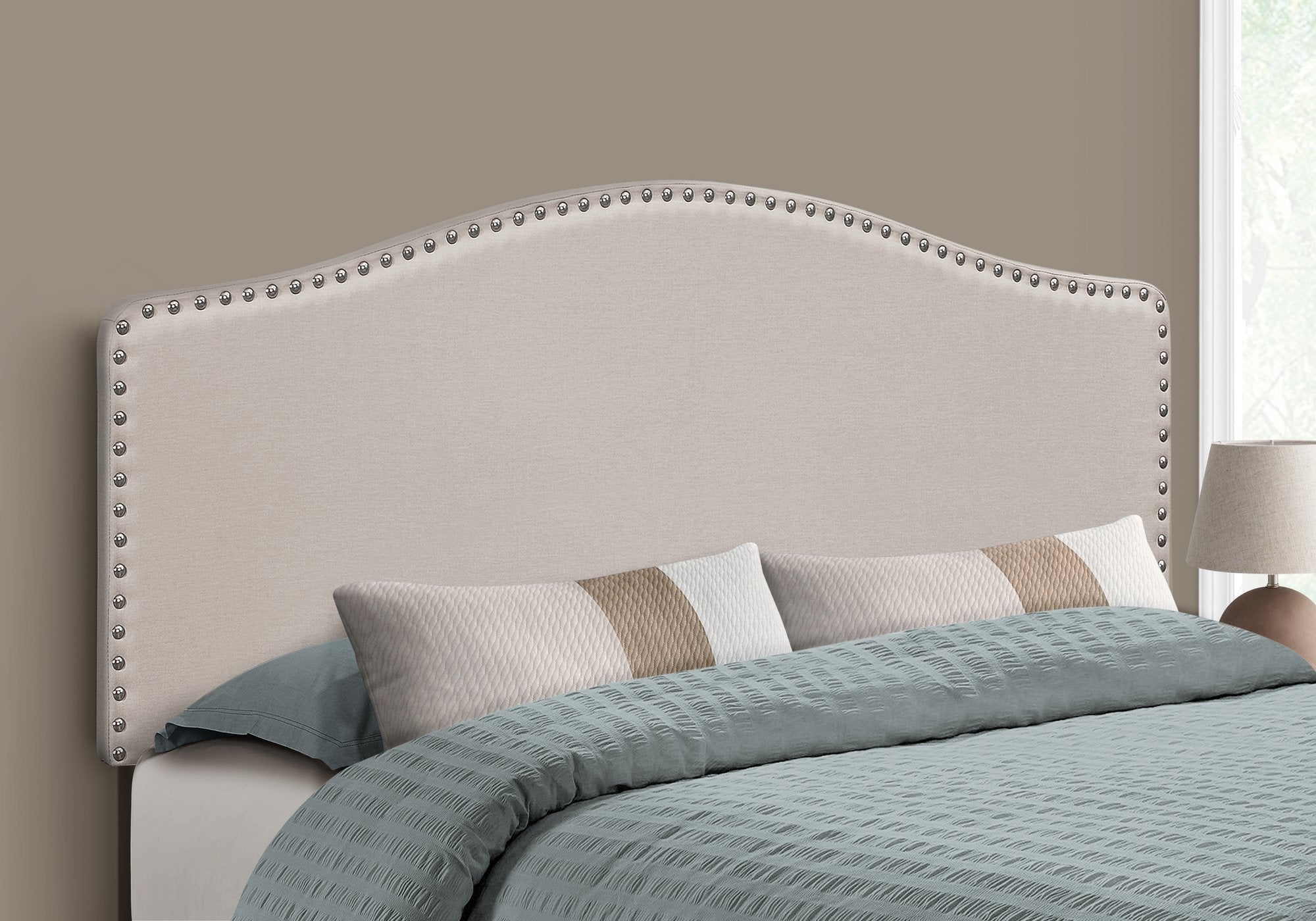 - Upholstered arched top headboard in a beige linen-look fabric with silver-finish nailhead trim