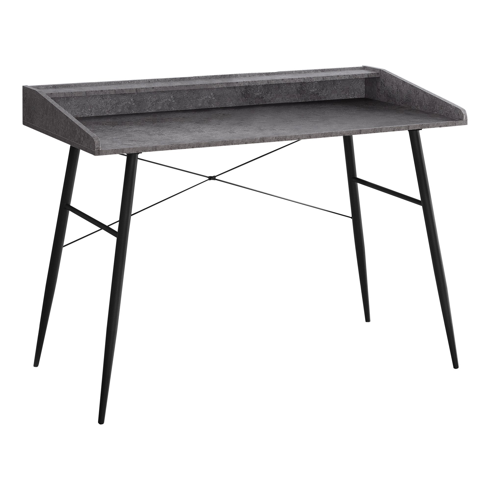 This computer desk with hutch in a grey stone-look finish will take your home office to the next level. The sides of the desktop gradually rise to meet the hutch for a sleek look. The top of the hutch doubles as a shelf, while the space underneath is divided into 2 storage cubbies where you can tuck away small items and keep your work surface organized. Providing support and stability is a metal base in a black finish and featuring striking design details, like tapered metal legs and slender X-shaped support bars. This laptop or writing table has a compact design and mid-century modern style that is a great choice if you use your living room or bedroom as a home office.
