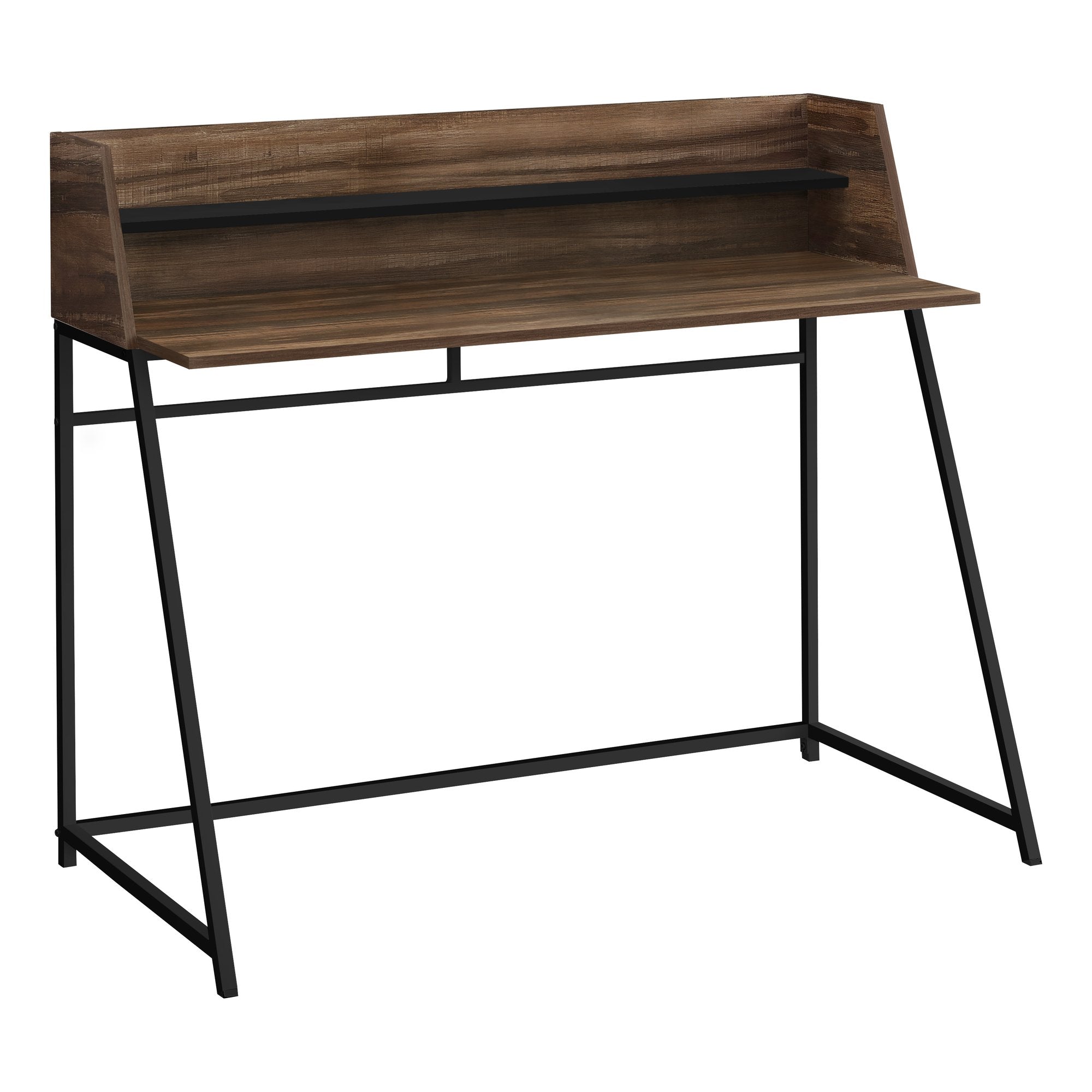 Look at your home office from a different angle with this computer desk featuring a storage hutch. Finished in a brown reclaimed wood-look laminate, the compact desktop has side panels that slant to seamlessly align with the attractive, trapezoid-shaped metal legs for a clean look. The hutch includes 1 long shelf in a contrasting black finish that is the ideal size to hold small items like wireless speakers or a block of sticky notes. Supporting the desktop is a sturdy metal base in black with a support bar on back that runs parallel to the shelf. This contemporary laptop or writing table with a space-saving design is a great choice if you use your living room or bedroom as a home office.