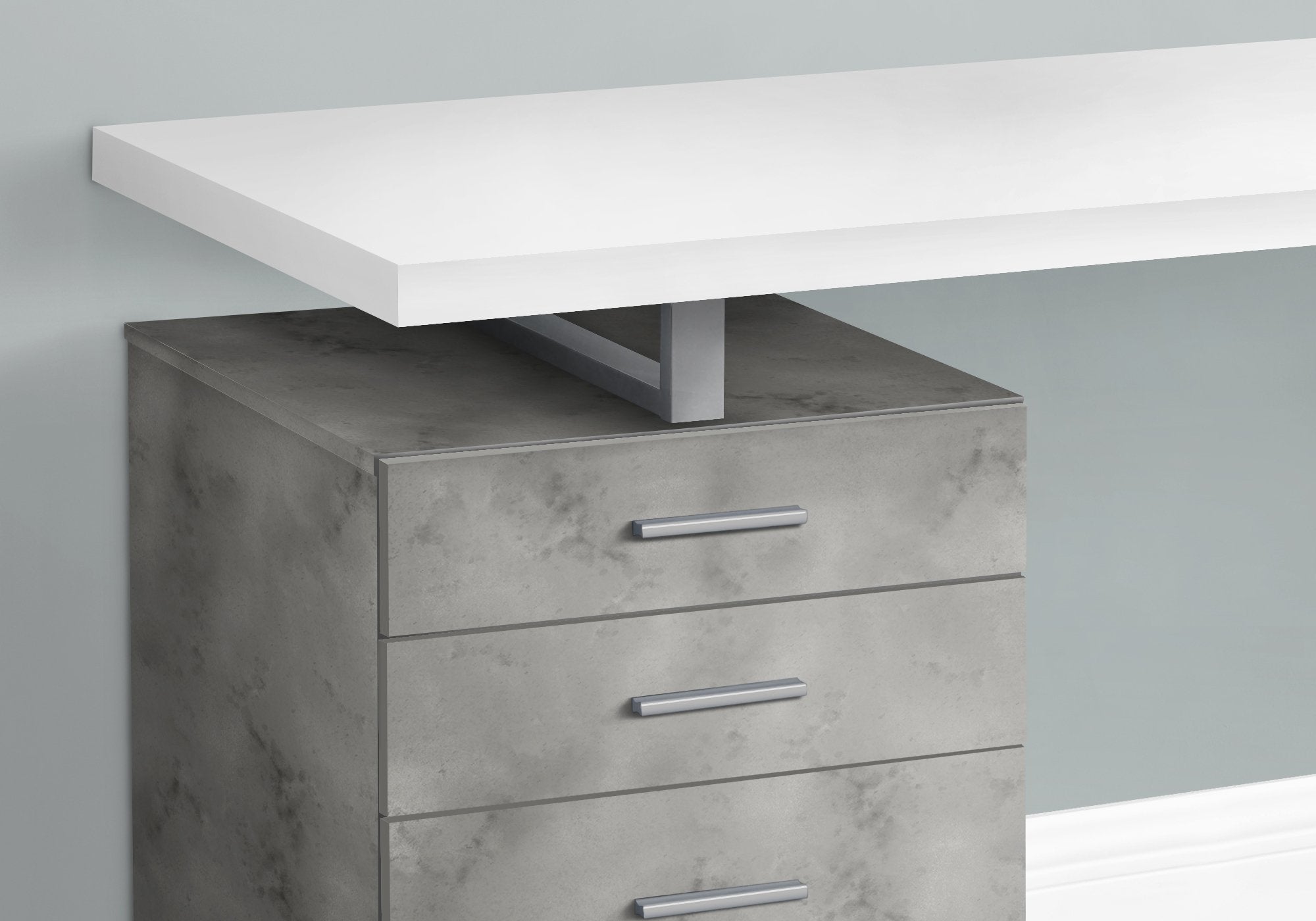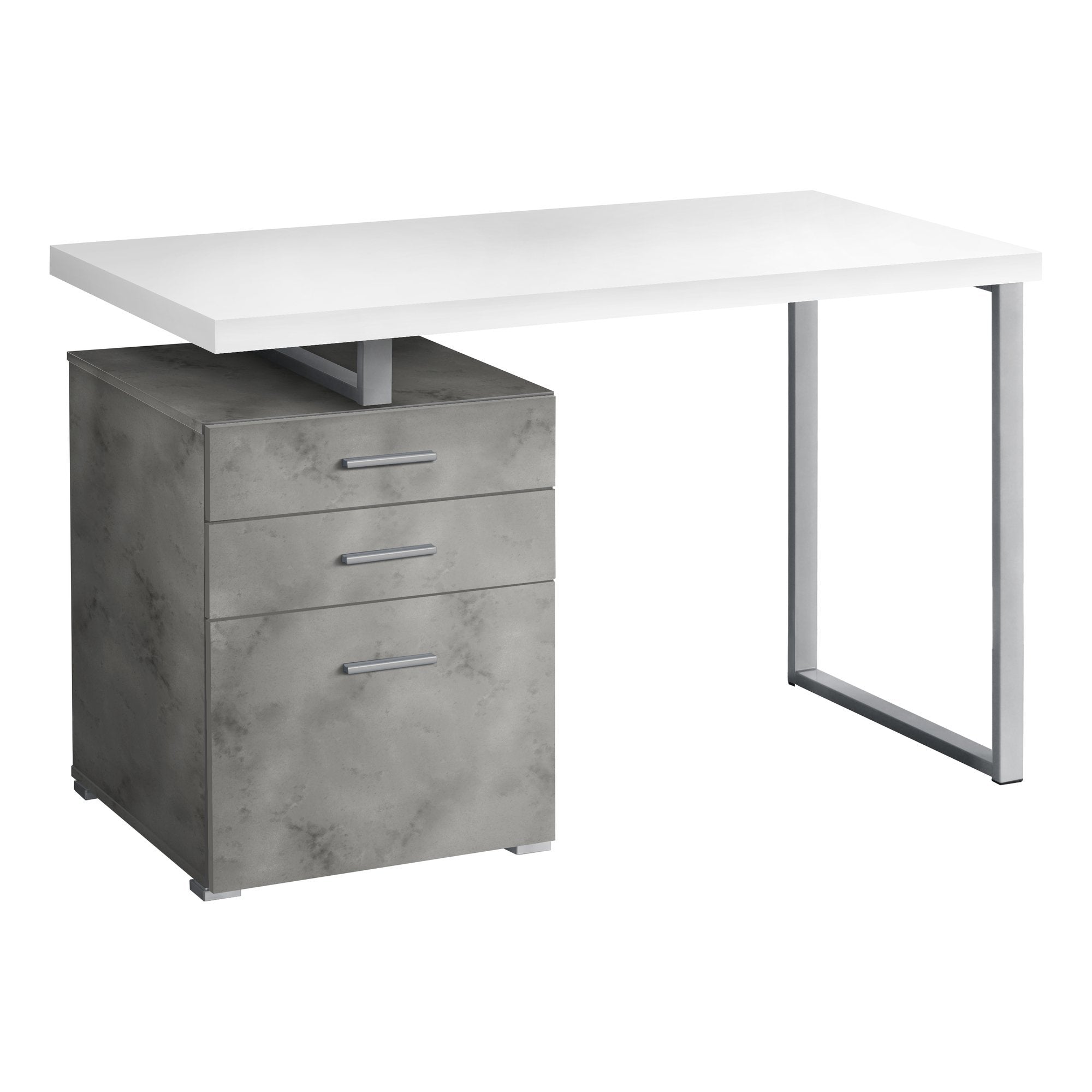 Maximize your home office space and your productivity with this computer desk with 3 storage drawers. The thick-panel floating desktop provides room for the essentials you need to work and allows you to use the top of the drawer unit as an extra surface. Finished in a grey concrete-look laminate that contrasts the white desktop, the drawer unit includes 2 small drawers and 1 large drawer with a bar for hanging files and offers space for items you want to keep off the work surface. The drawer unit is reversible and can be installed on the left or right side according to your preference. Supporting the desk is a metal leg in a silver finish with a modern, stylish U shape.