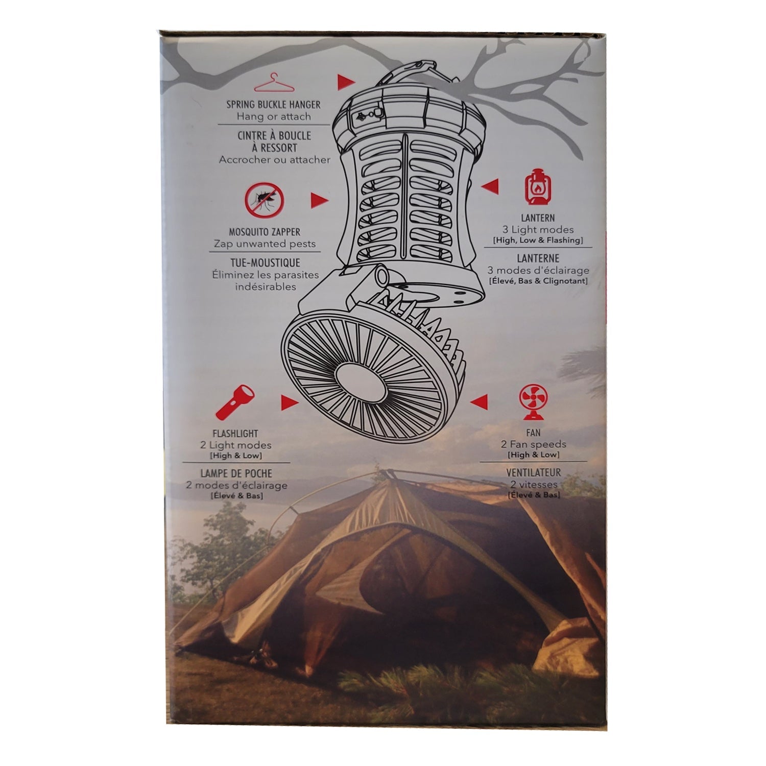 Go to any adventure more equipped than ever with this 4-in-1 lantern from RCA. A powerful hanged lantern to light you up in the evening, a flashlight to walk around, a fan to cool you down and mosquito killer grill to protect you from the bites of those pesky critters! Ideal for camping!