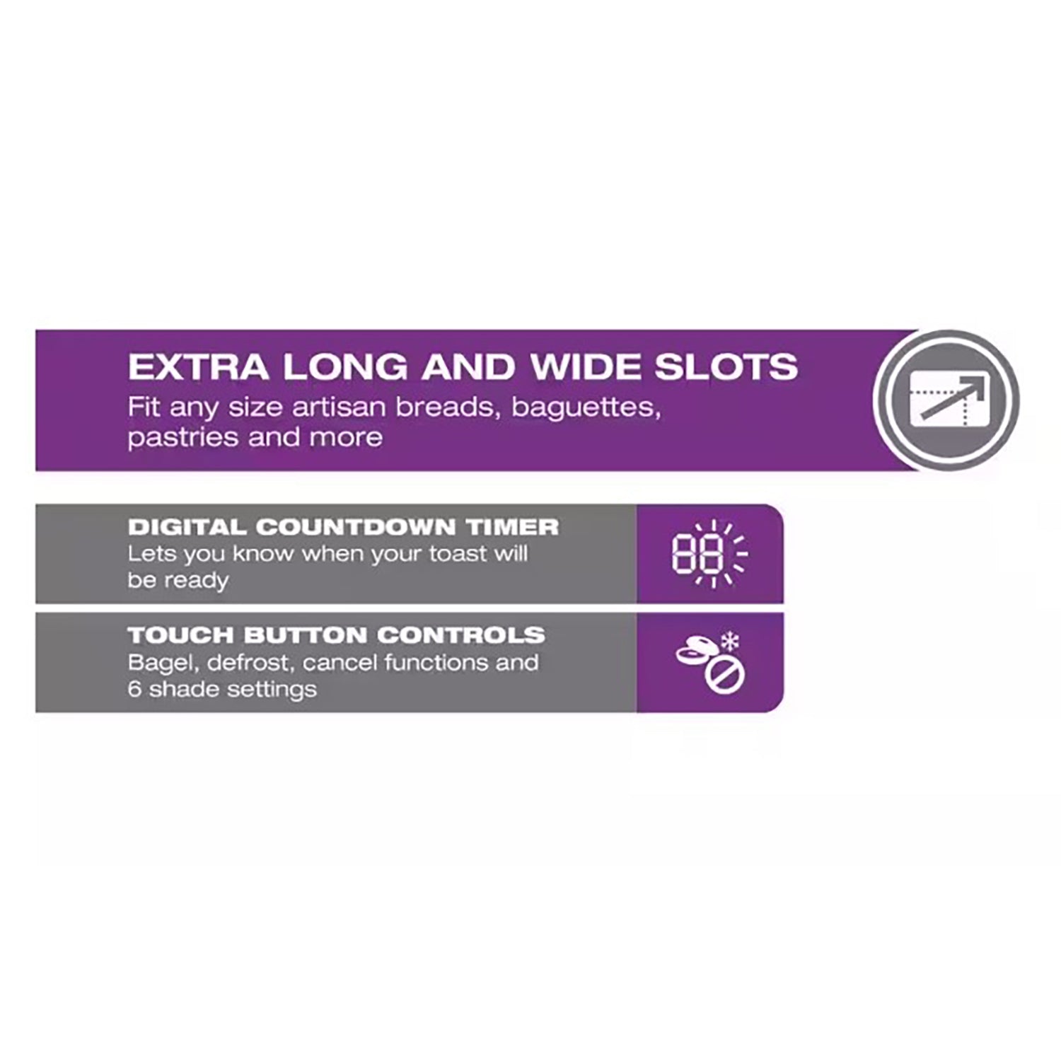 Blending style and performance, Salton's long-slice digital toaster is the perfect addition to your kitchen. Its elegant design enhances the countertop while saving space. Long, wide slots accommodate thick slices, bagels and artisan breads. Variable browning control, with 6 positions, ensures consistent results every time. Toast one side of bagels, defrost frozen products and enjoy convenience with bagel and defrost functions. Self-adjusting guides ensure even browning, and the anti-kickback safety feature offers extra peace of mind.