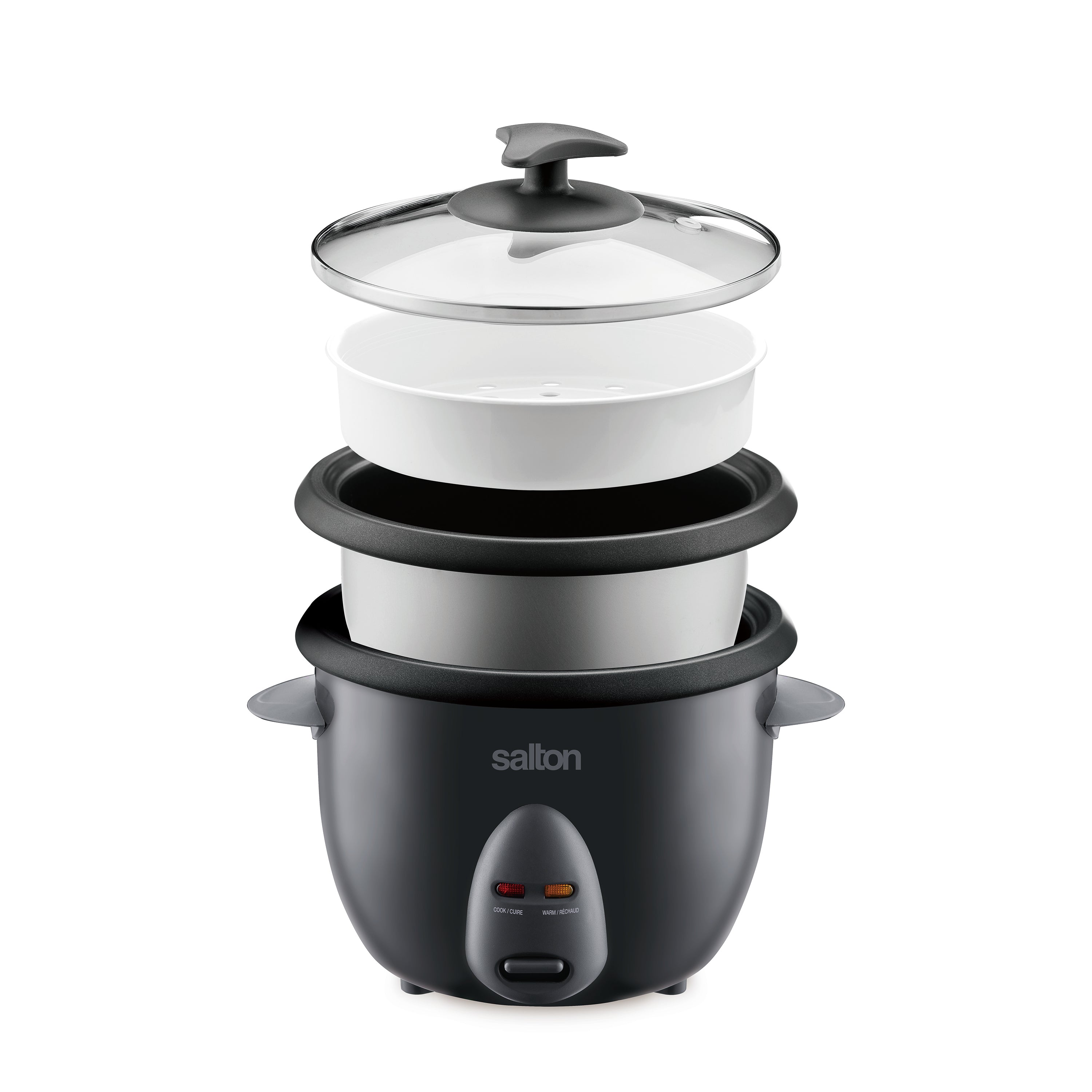 Salton’s 10 Cup Rice Cooker can cook up to 10 cups of rice or grain and keep it warm until you are ready to serve. Not only does it make the perfect amount of fluffy rice every time, but the included basket can be used to steam seafood, poultry, and vegetables even while rice cooks below. Conveniently, the steaming basket doubles as a ‘rice rinser’ - rinsing rice before cooking helps prevent clumping for a fresher, more authentic taste and texture. The non-stick bowl removes for easy cleaning! Comes with a convenient ‘stir and serve’ spatula, and a glass lid to monitor the cooking process for a Simple Mealtime Solution™.