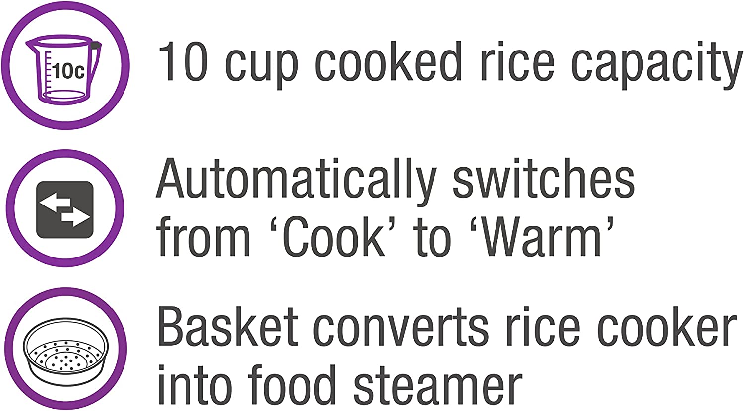 - STEAMING BASKET INCLUDED - Steaming basket, measuring cup and ‘Stir & Serve’ spatula included